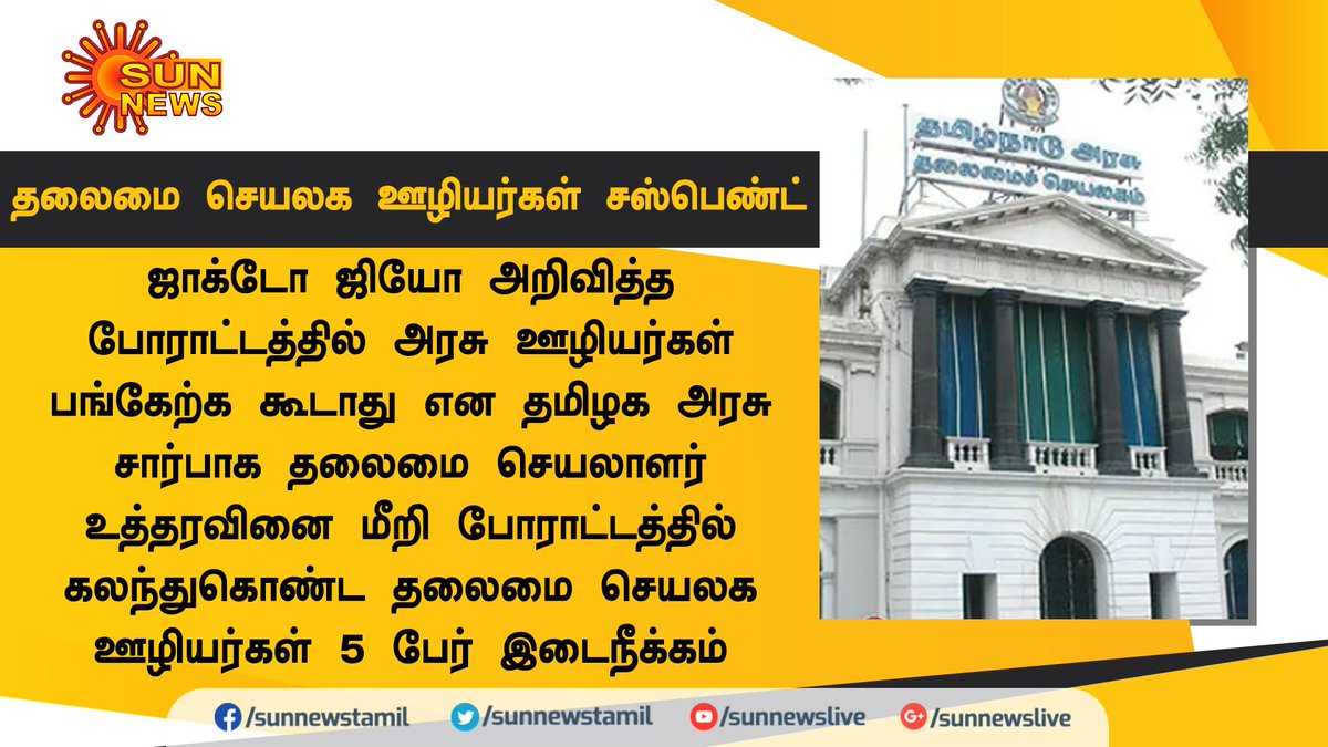 அரசின் உத்தரவினை மீறி ஜாக்டோ ஜியோ போராட்டத்தில் கலந்துகொண்ட தலைமை செயலக ஊழியர்கள் 5 பேர் இடைநீக்கம்