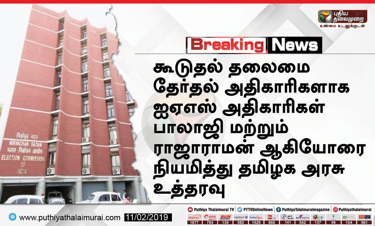 சென்னை: தமிழக கூடுதல் தலைமை தேர்தல் அதிகாரிகளாக, இரண்டு ஐ.ஏ.எஸ்., அதிகாரிகள் நியமிக்கப்பட்டுள்ளனர்.தமிழக தலைமை தேர்தல் அதிகாரியாக, சத்யபிரதா சாகு செயல்பட்டு வருகிறார். விரைவில், லோக்பா தேர்தல் நடக்க உள்ள நிலையில், கூடுதல் தலைமை தேர்தல் அதிகாரிகளாக, ஐ.ஏ.எஸ்., அதிகாரிகள், பாலாஜி, ராஜாராமன் ஆகியோர் நியமிக்கப்பட்டுள்ளனர்.பாலாஜி, பொதுப்பணித்துறை கூடுதல் செயலராகவும், ராஜாராமன், மருத்துவ பணிகள் தேர்வாணைய தலைவராகவும் பணியாற்றி வந்தனர். கூடுதல் செயலர்களாக, இருவரும், ஓராண்டுக்கு பணியில் இருப்பர் என, அறிவிக்கப்பட்டுள்ளது.